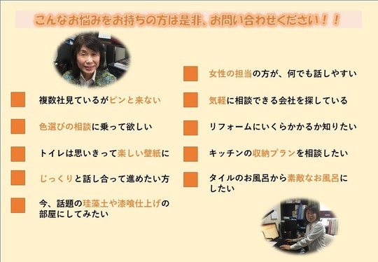 気になる住宅の水まわりリフォームについて、リフォーム提案士である女性スタッフが、親切・丁寧にご案内致します。
