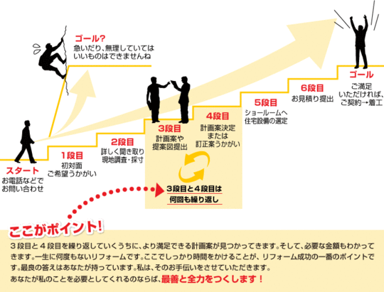 そのため、ご相談や問合せの対応をするリフォーム提案士は、住宅リフォームが初めての方にもご理解いただけるよう、建築専門用語を使わずに、分かりやすく丁寧に、お話させていただいています。