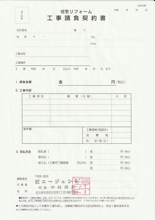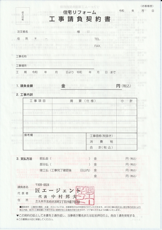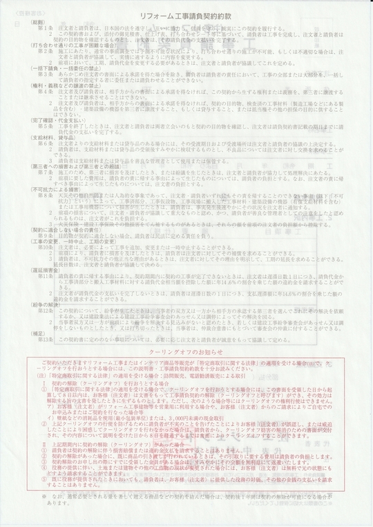 弊社のリフォーム工事請負契約書一式をご覧下さい。
